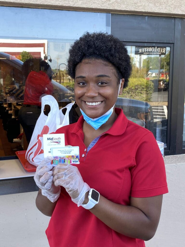 [toggle title=”Read More”]MidSouth Community FCU President/CEO, Roy Bibb, gifted a Chick-fil-a employee with a $25 VISA gift card while she was working the drive-thru. We appreciate the safety measures Chick-fil-a has put into place to accommodate its loyal customers during the pandemic.